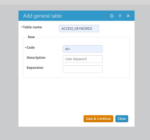 If the ACCESS_KEYWORDS table is not listed in the drop down list, scroll to the bottom of the list and select New Table and enter ACCESS_KEYWORDS then click Save.