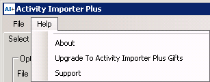 NOTE: If you are upgrading Activity Importer Plus to Activity Importer Plus Gifts, you will need to enter your new license key. This can be done through the main AI+ File Load screen. Navigate to Help > Upgrade To Activity Importer Plus Gifts.