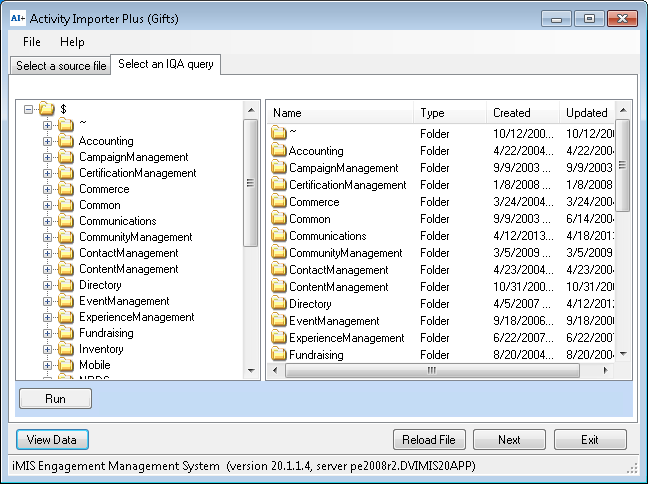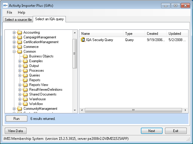 After the login and password have been verified, Activity Importer Plus will try to look to determine if IQA is enables within iMIS. In order to support IQA within Activity Importer Plus, you will need to install the iEmail Web Services. If you do not so this, when you click on the Select an IQA query tab, you will receive an error.
