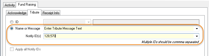When selecting the radio button option "Name of Message" the "Apply all Notify IDs" checkbox will automatically be disabled and the textbox field to enter the tribute information will be available as well as the textbox for the "Notify ID(s)".