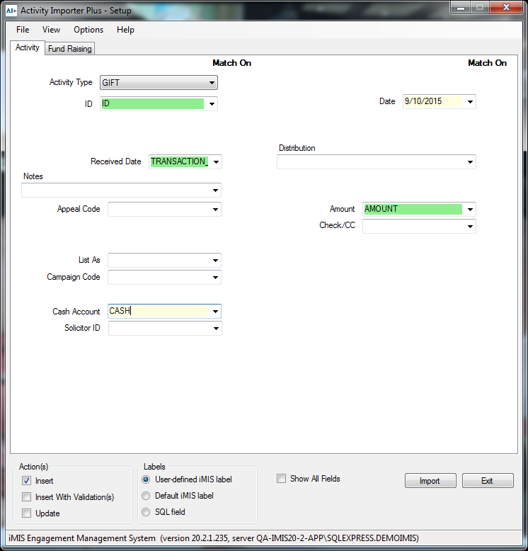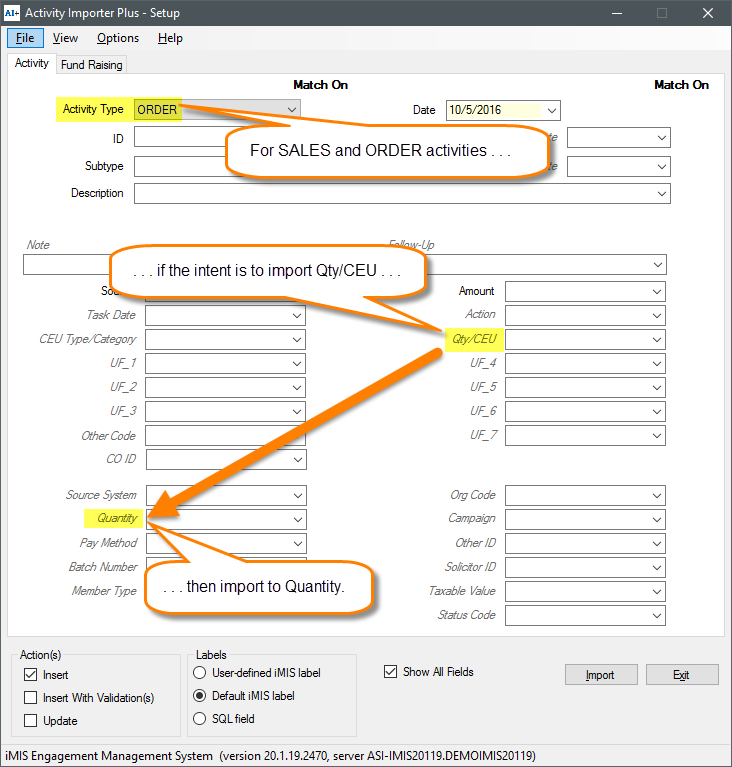 Therefore, to match the behavior of iMIS when importing SALES and ORDER activities, data which normally would be imported to Qty/CEU ("Default iMIS" label mode) should instead be mapped to Quantity("Default iMIS label" mode).