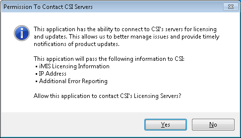 Note: Changing the "Licensed To:" name for iMIS will require a new license key. If the license key detects a change in this, it will follow the same process as above trying to call back to CSI to verify your product information. In most cases, if you are prompted for license information it is likely that CSI does not have your updated iMIS information. Contact CSI at support@csiinc.com with a screen shot of the current iMIS System Setup and a new key will be emailed to you.