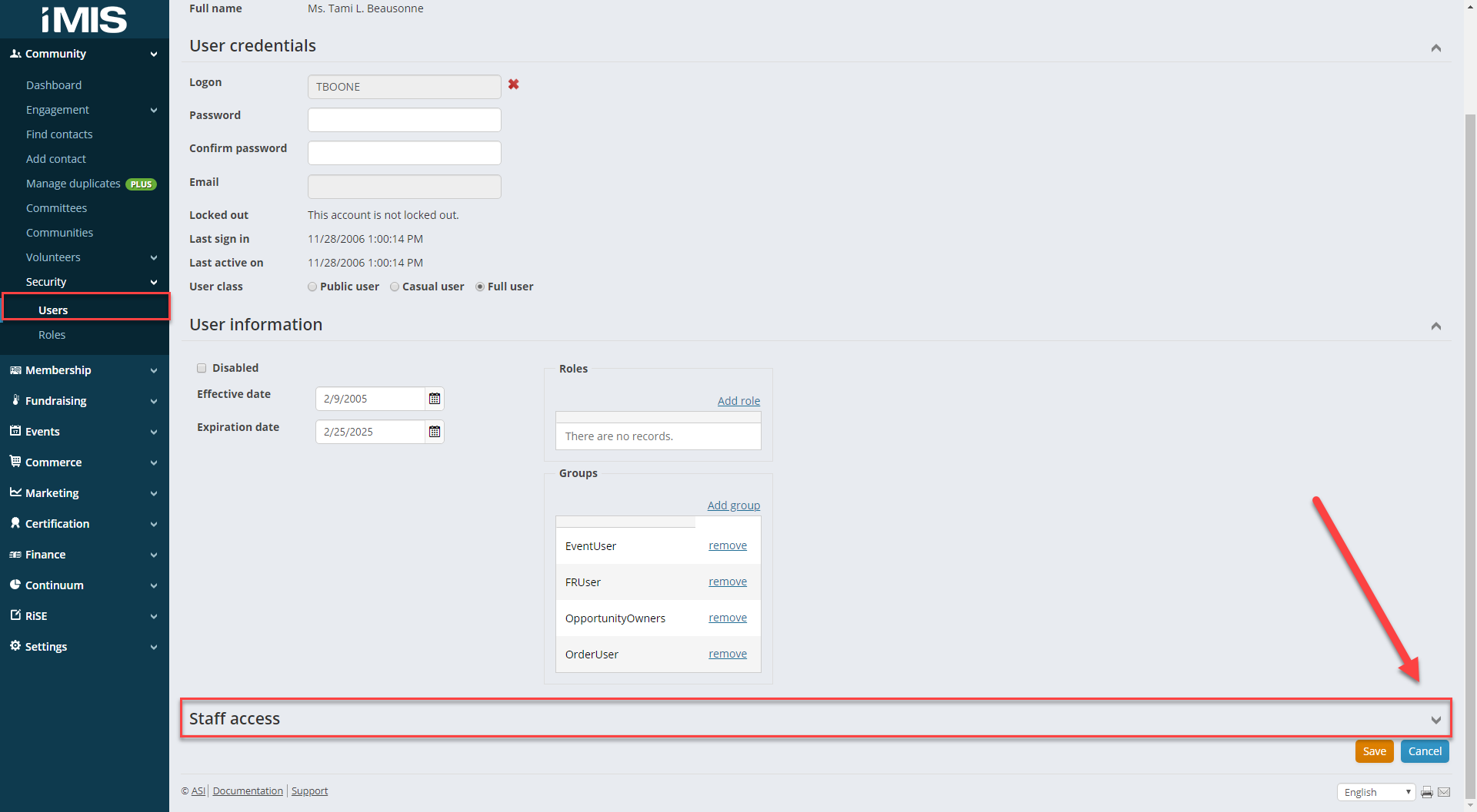 Scroll down to Staff access and hit the arrow on the right to expand the section