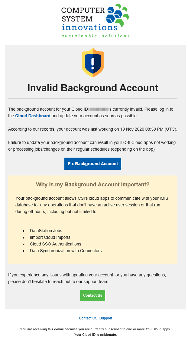 Update your Background Account in the CSI Cloud Dashboard (see above).