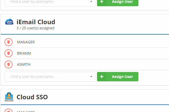 On this screen, you will see a list of all licensed cloud apps. To add a user, start typing an iMIS username in the box. Click to select one, and then press Assign User.