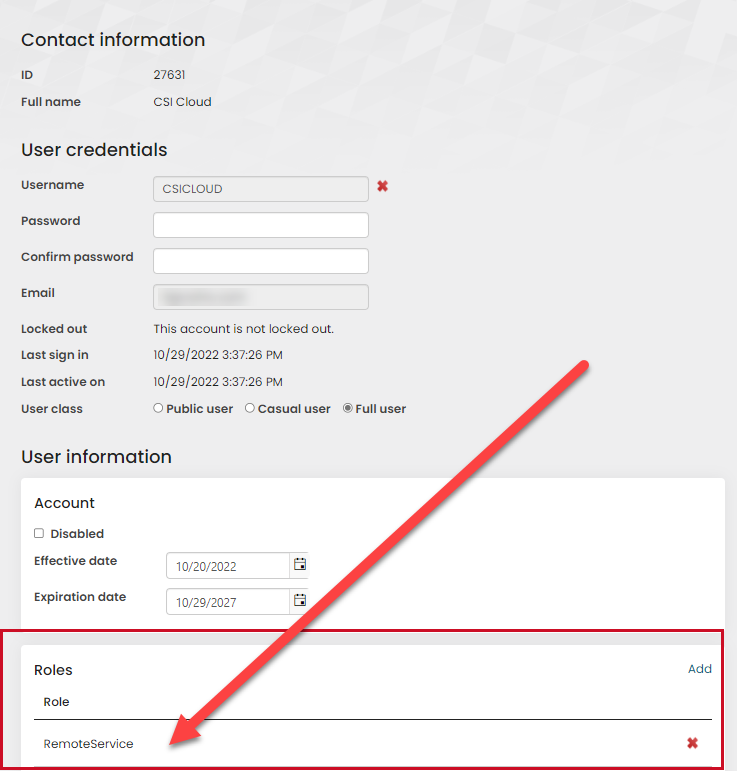 Near the bottom of the page under User information, in the Roles section, click Add role