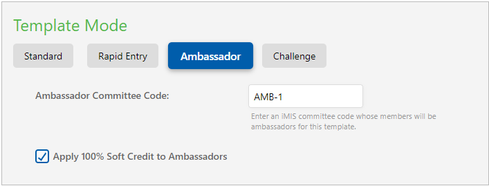First, edit a template and change the mode to Ambassador. Enter a valid iMIS committee code, and optionally, you can choose to soft credit ambassadors with each gift entered on their template.