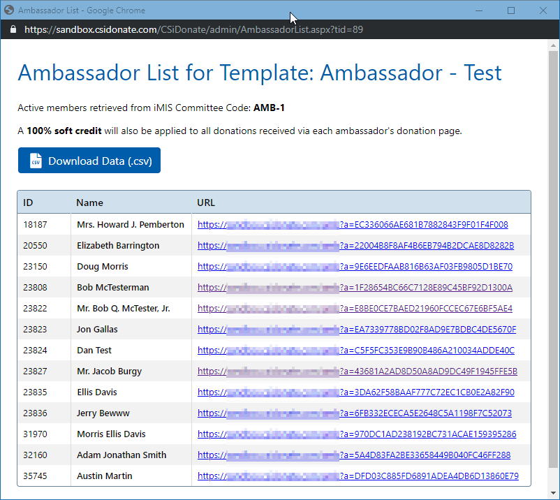 One of CSiDonate's Template modes is Ambassador Mode. Ambassador mode allows a CSiDonate staff user to select an existing iMIS committee and generate unique donation links for each active member in that committee. Then, each ambassador can raise funds using their own personalized link. Donations are tracked in a CSiDonate table which can then be reported on.
