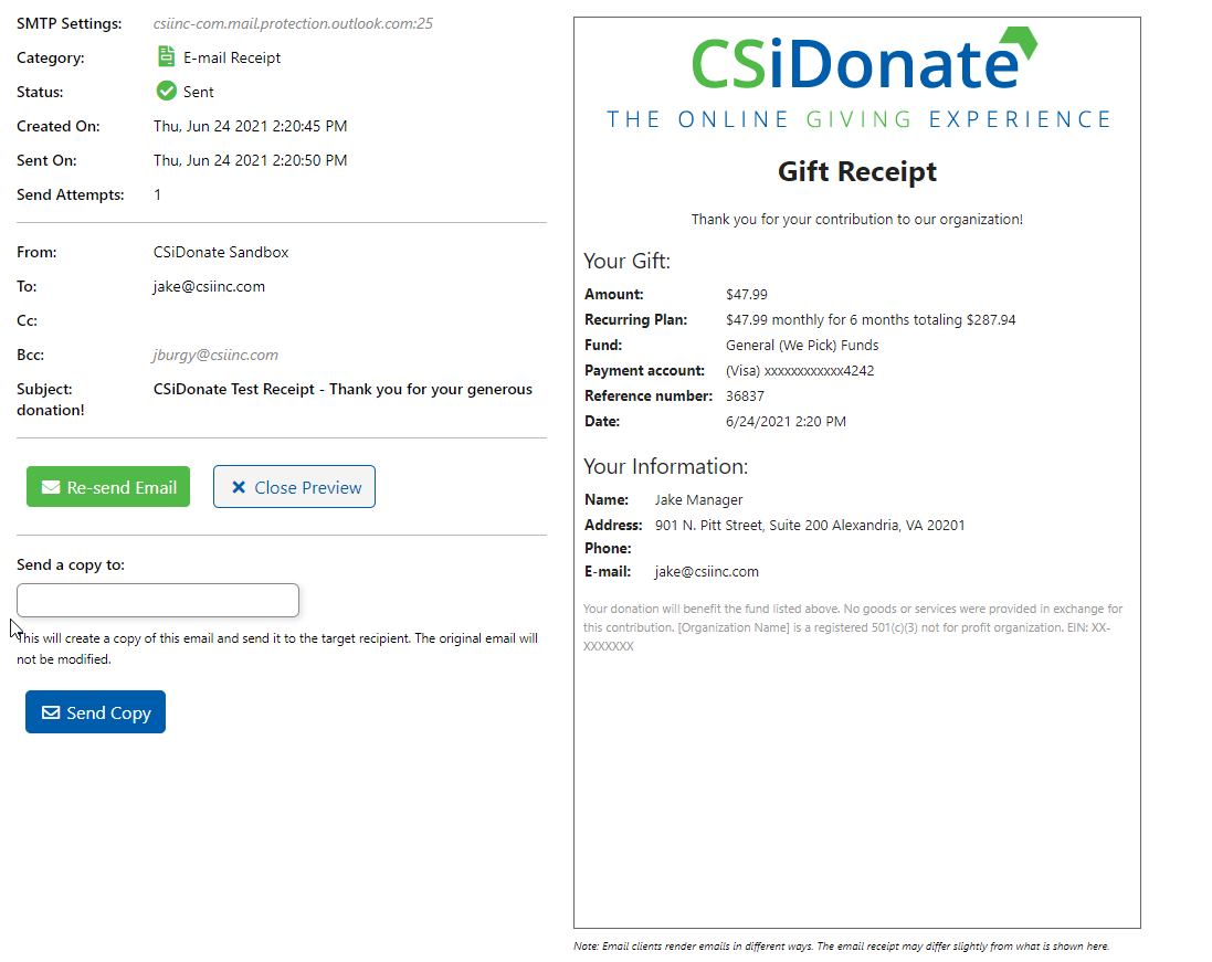 You can view the complete list of emails in the CSiDonate Admin Area, by going to the Email Queue page.