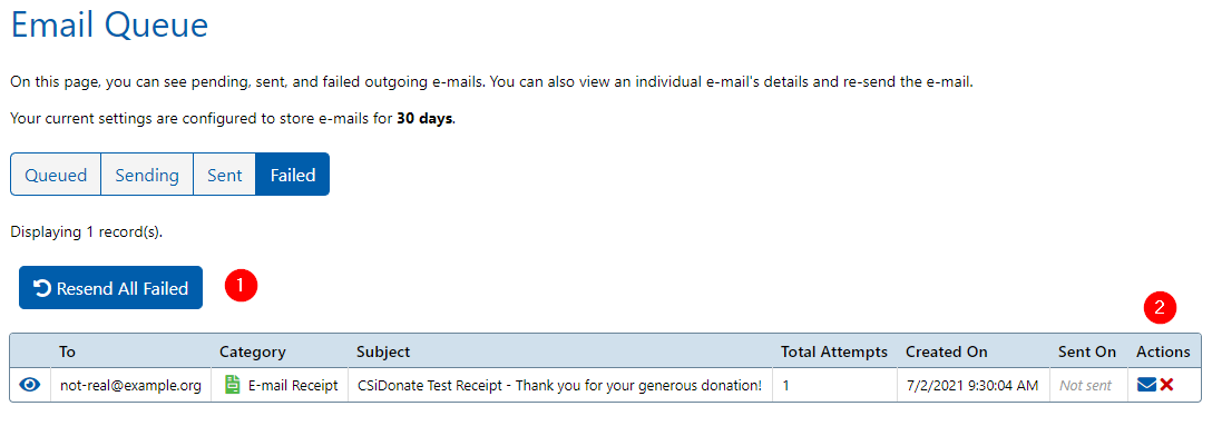 The Email Queue admin page allows you to review, manage, and re-send any email that originated from CSiDonate.