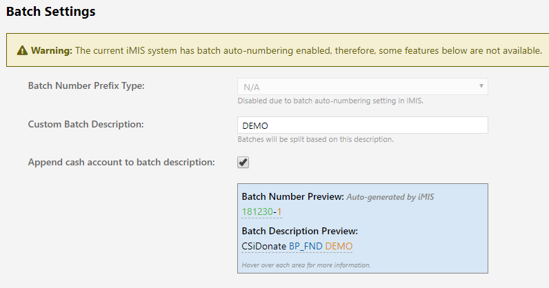 The Batch Settings area changes depending on if batch auto-numbering is enabled or not in iMIS.