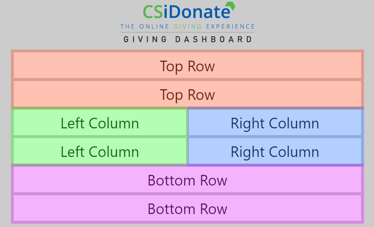 The Giving Dashboard has four zones for widgets: Top Row, Left Column, Right Column, and Bottom Row.