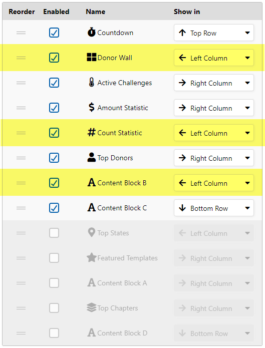 Even though the Donor Wall, Count Statistic, and Content Block B are not next to each other in the layout list, because they are all in the Left Column zone, they will display on the page in the same order they are listed in the table: