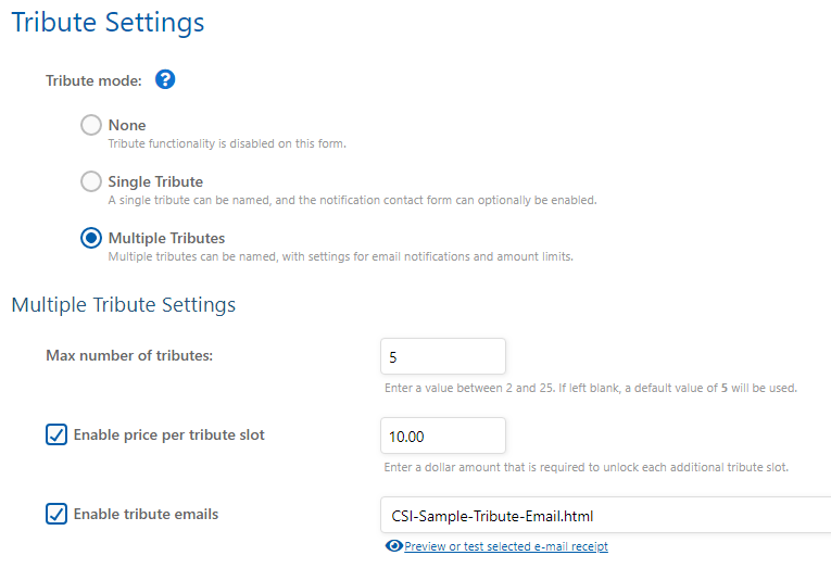 The following fields are optional multiple tribute settings which you can enable to provide additional functionality to your donors.