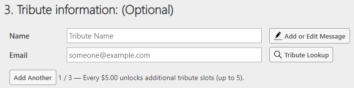 For example, if you set a price per tribute value of $5.00, and a donor selects a $15.00 donation, they will see the following screen: