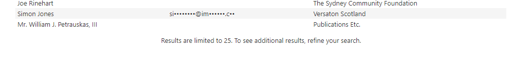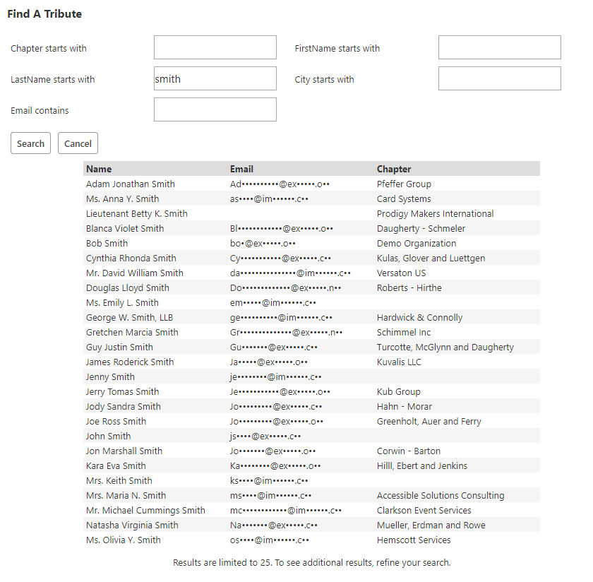 The System Setting Tribute search results limit determines the number of records that are shown to the donor in the search results. Set this value to a reasonable number where a donor can find another member that he/she is looking for, but not enough to expose an unwanted amount of data. If a search contains more than the defined maximum, the donor sees this message: