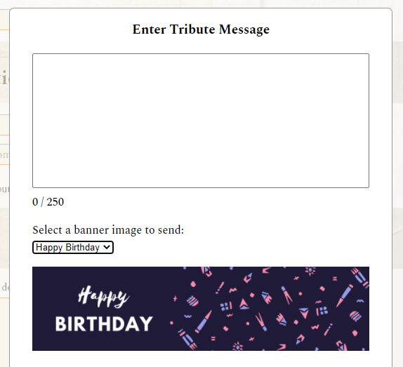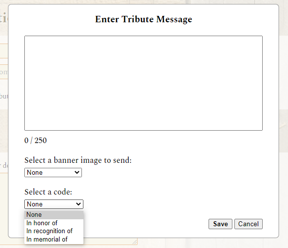A tribute message can be provided by clicking the Add or Edit Message button. Donors can type a personalized message to that tribute (up to 250 characters).