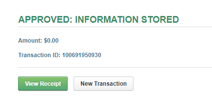 If successful, BluePay will respond with APPROVED: INFORMATION STORED. This is a successful message which tells you the credit card information was stored for later processing (the Start Date above), but was not charged today.