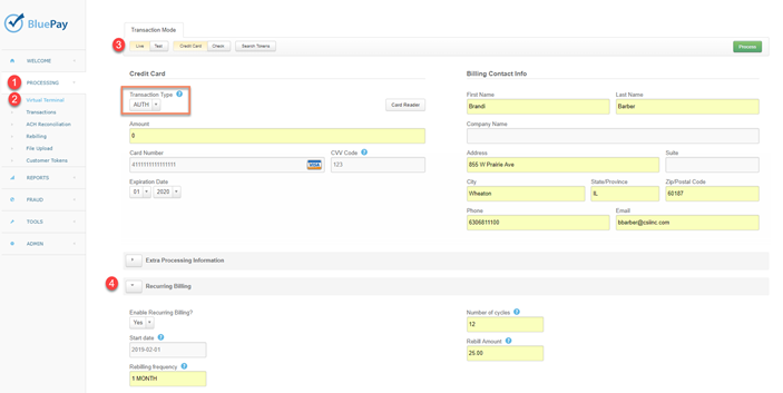 Start by logging into the BluePay portal. Then go to Processing > Virtual Terminal to enter a new transaction.