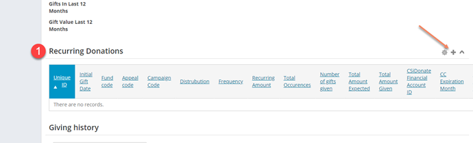 Search for the donor profile in question. To enter the plan info, locate the recurring donations panel and click the plus sign to add a new entry.