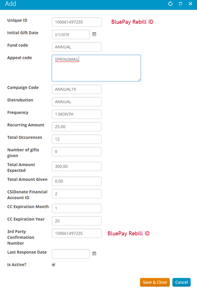 Is Active | N/A | Must be checked. (If not checked, automatic recurring gifts from BluePay will not be entered into iMIS.) |