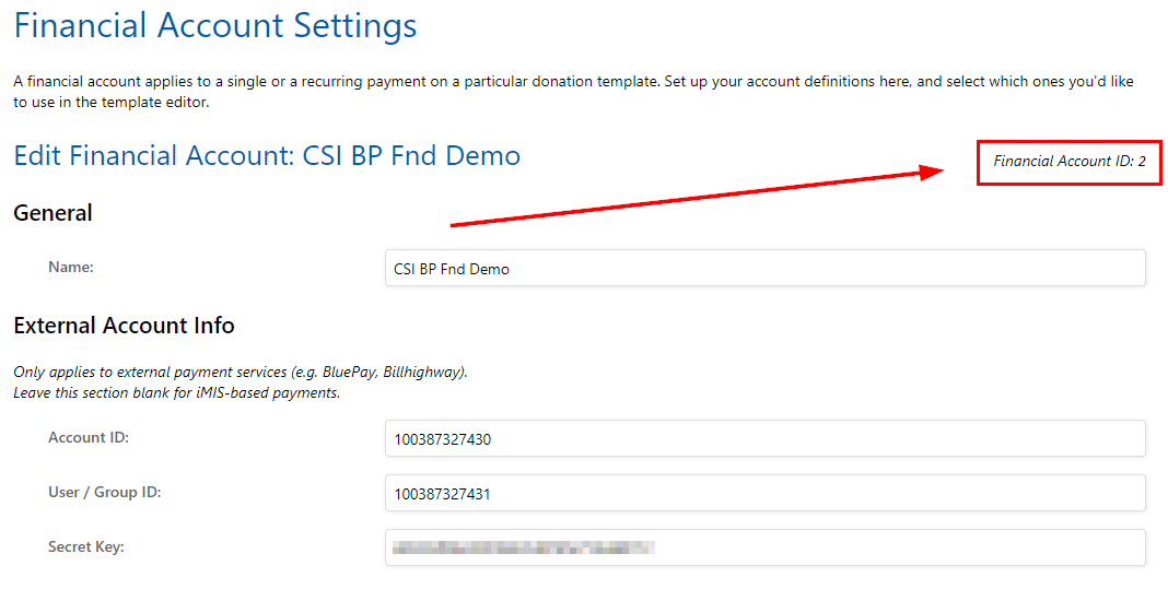 On the Edit screen, in the upper-right corner, take note of the Financial Account ID as we will use it in the next step.