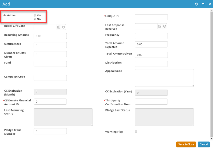 Setting the IsActive flag in iMIS to 0 (unchecked) and leaving the recurring gift plan in BluePay as active will continue to charge the card on file, but you will not see any data correctly written back to iMIS, as iMIS is expecting the gift plan to be deactivated. It is incredibly important to have both the IsActive flag unchecked and the rebilling plan cancelled in BluePay to end a recurring gift.