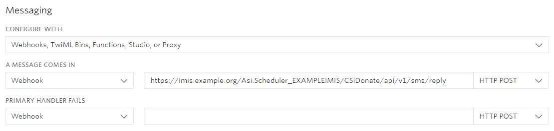Under A Message Comes In, select Webhook, and paste in the SMS Reply URL found in the CSiDonate System Overview page.