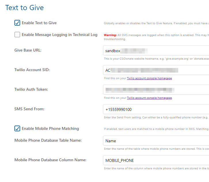 Activate Text to Give in your CSiDonate system settings using your Twilio Account Key and Secret.