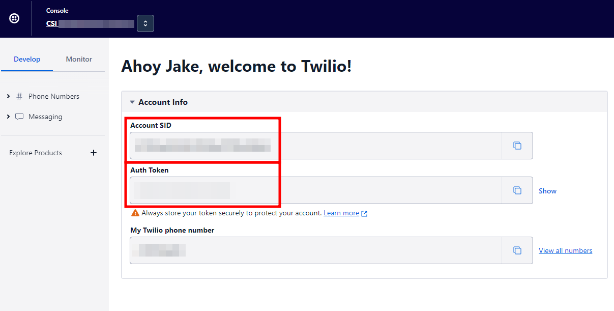 Under Account Info, copy your Twilio Account SID and Twilio Auth Token (click "SHOW" in the box to see it if you need to verify it), and store these values temporarily for later.