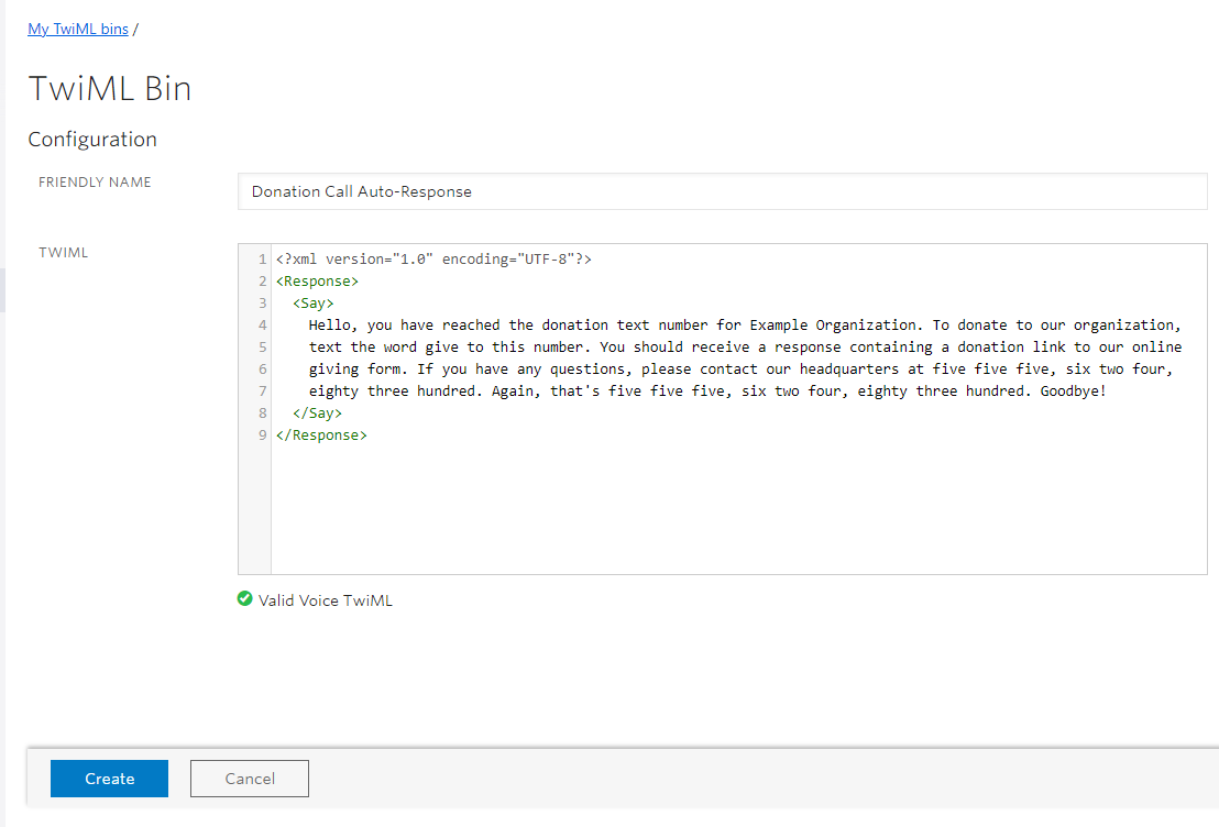 Then, in the TwiML field, copy and paste the following code, replacing this sample with your own customized message.