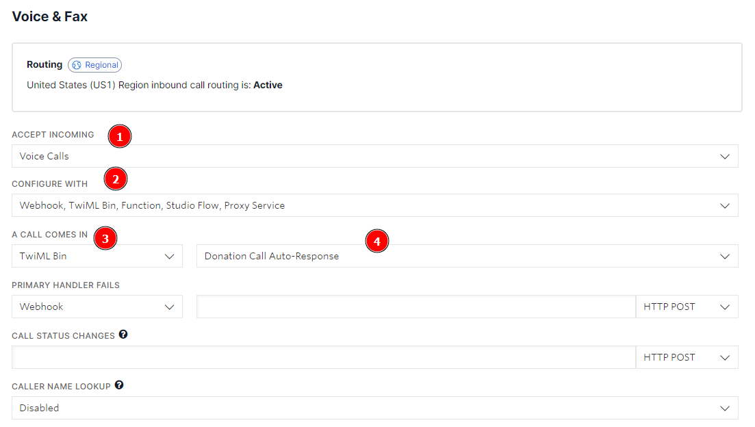 Finally, under A Call Comes In, select TwiML Bin from the first dropdown, and then select the Donation Call Auto-Response from the second dropdown.