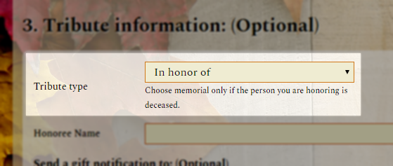 The Honoree Name field is a text field where the donor can name an individual, an organization, a family, or any other entity.