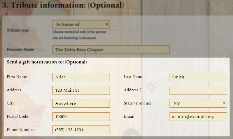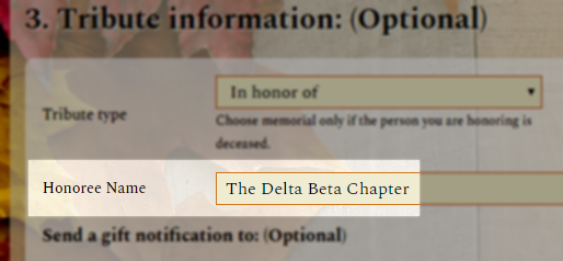Entering "Alpha Gamma Chapter" as the honoree text, and entering Alice Smith, the chapter president, into the Tribute Notification Contact so she receives a notification that a gift was made in honor of the chapter.