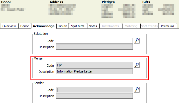 The selected merge code is stored in iMIS under the Acknowledge tab, in the Merge field: