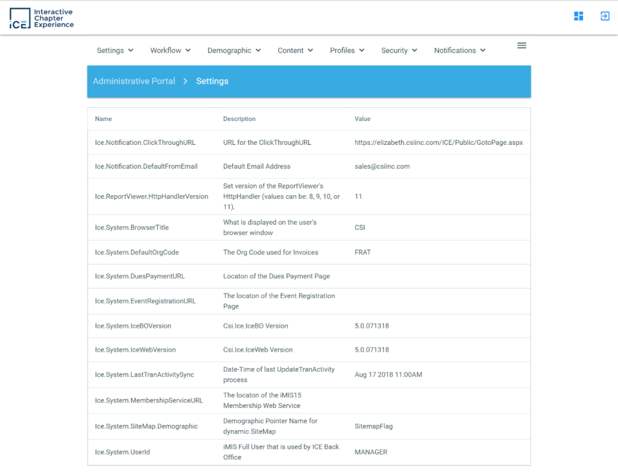 The ICE admin site is used to define specific settings and enables configuration for unique processes and scalability. It is important to follow the predefined steps to ensure that integration between ICE and iMIS is working properly. The ICE admin URL is your normal ICE url plus /Admin after /ICE/. Example: http://website.org/ICE/Admin