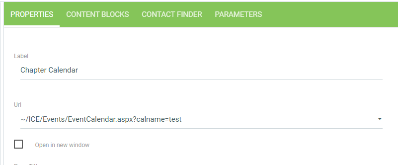 - Add a new sitemap node and select the "~/ICE/Events/EventCalendar.aspx?calname=" option