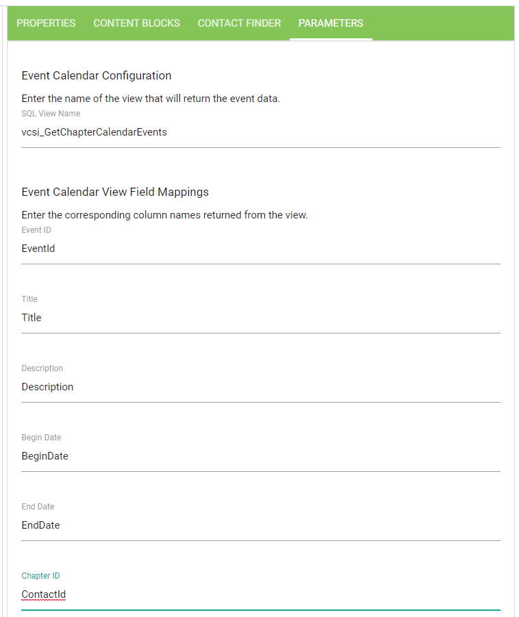 SQLCREATE VIEW [dbo].[vcsi_GetChapterCalendarEvents] AS SELECT d.WORKFLOWTRAN_KEY as EventId, d.ID as ContactId, d.Title as Title, d.Description as Description, d.CD_Start as BeginDate, d.CD_End as EndDate FROM Demo_Chapter_Dates d GO- Enter the name of the view on the Parameters tab.
