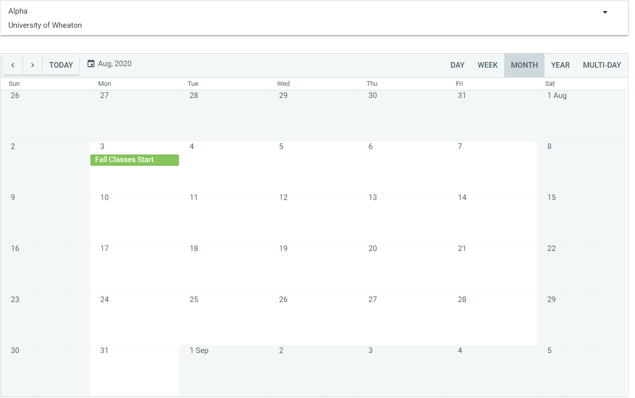 Field Data Type Description Event ID CHAR ID to identify unique event (workflowtran_key could be used) Chapter ID CHAR ID to be passed in for ContactID parameter. Title CHAR Title to be shown for event Description CHAR Description to be shown for event Begin Date DATE or DATETIME Start date of event End Date DATE or DATETIME End date of event Example View