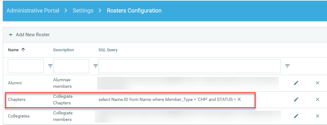 - Create a roster query that will contain the applicable chapters/companies. (Settings > Rosters Configuration)