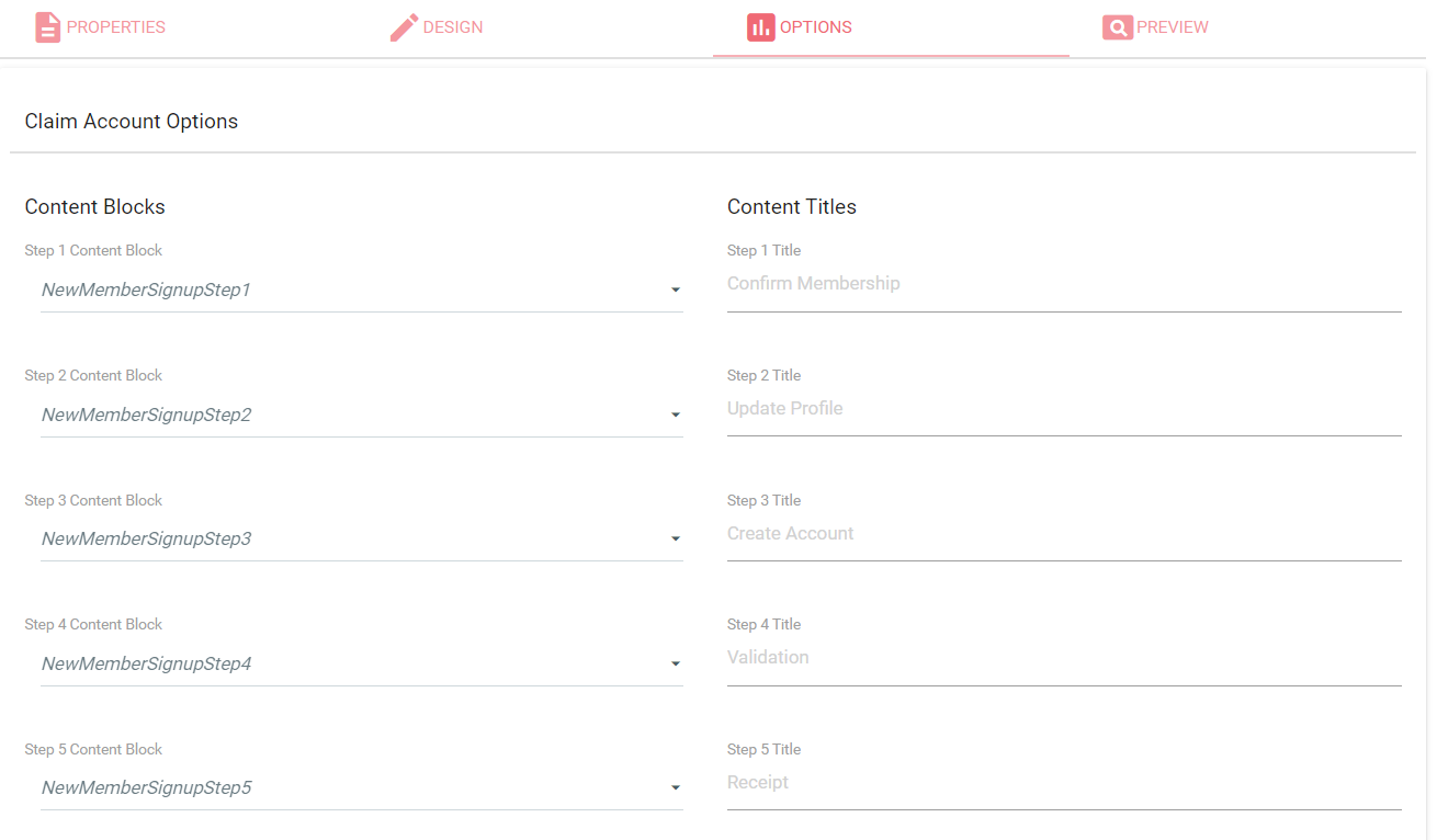- The Options tab allow you to specify the content blocks that should be used for each step.