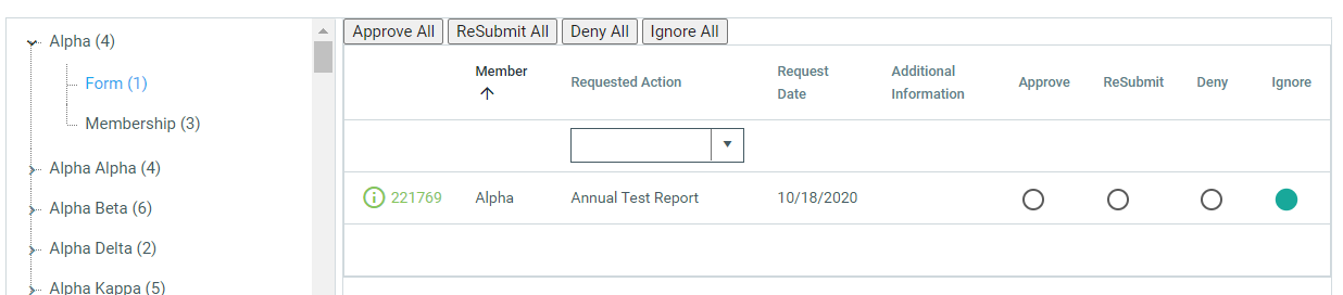 The form has been selected for ReSubmit and the reviewer can add comments as with approvals/denials.