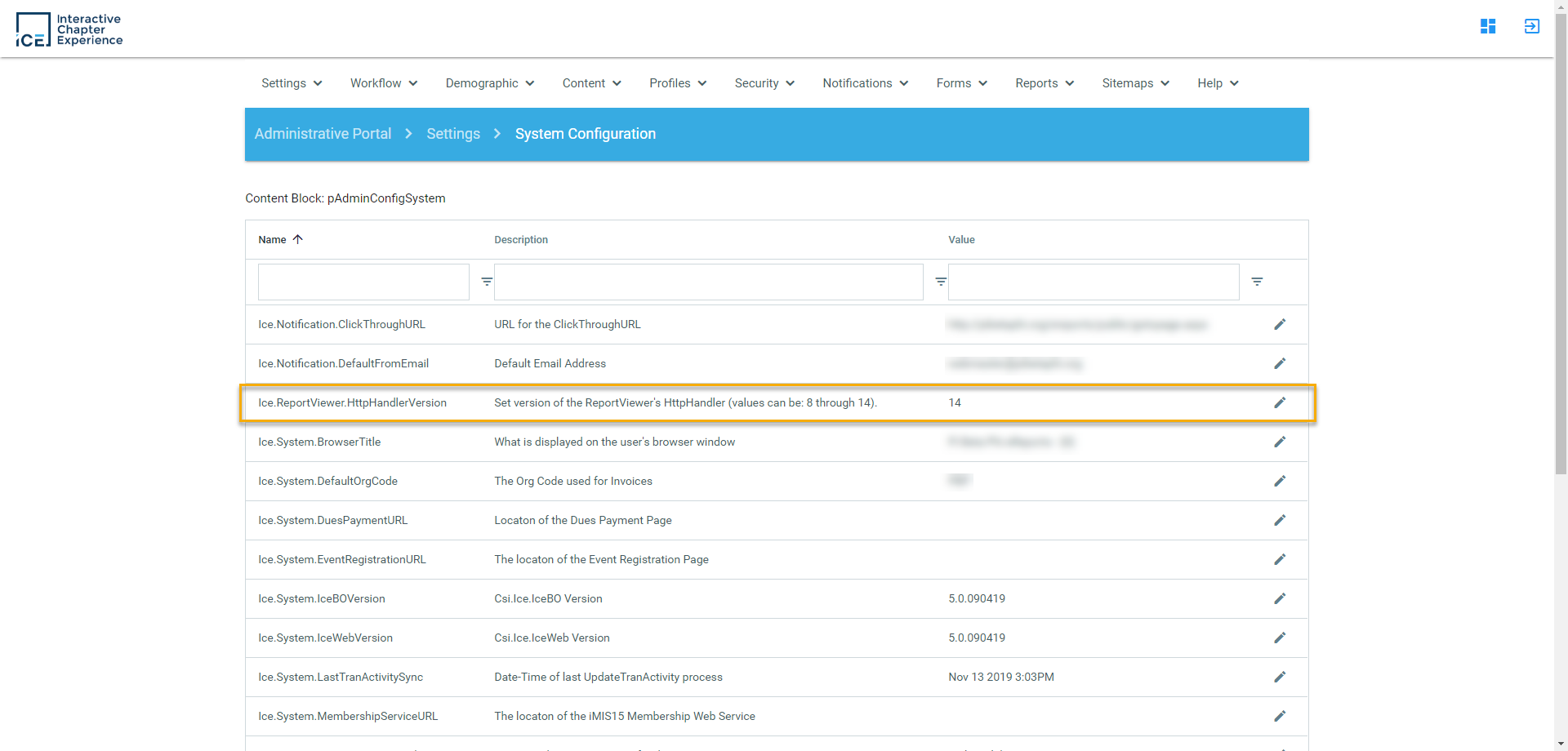 Choose edit (pencil icon) to update the value of the following attribute: Ice.ReportViewer.HttpHandlerVersion