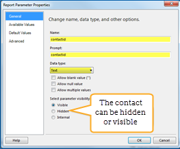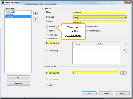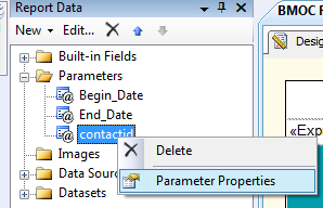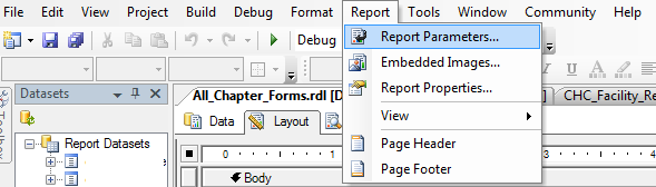 If this report is intended to display chapter-specific data based on a user's login, a parameter named @contactid must be added to the report. ICE will pass the chapter's iMIS ID to filter the report. You must have Microsoft Visual Studio to create, edit, and/or upload your SSRS reports. This example is from Microsoft Visual Studio 2005 and Microsoft Visual Studio 2008. Please remember SSRS variables are case-sensitive and should have no spaces or special characters other than an underscore. SSRS will automatically create the parameter for you when you enter it into the dataset.