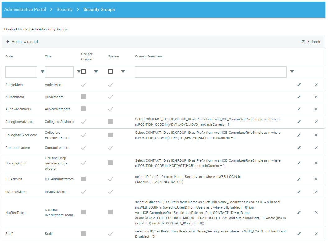 A Security Group is a defined group of users established by a custom SQL statement. The query returns the list of iMIS ID values of the members in the Security Group.