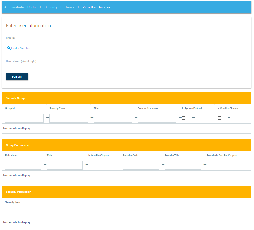 To identify an ICE user's access level, go to Security > Tasks > View User Access. Enter the username or iMIS ID of the user.