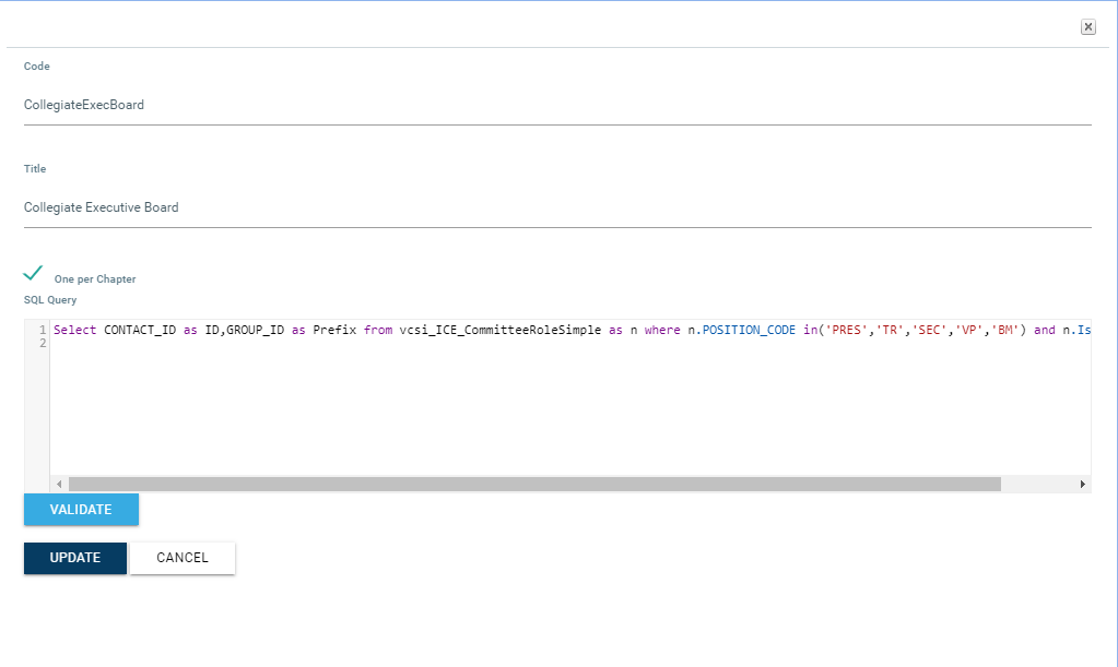 Check the One per Chapter checkbox control if your SQL query will return a company/chapter ID value along with the user/member ID
