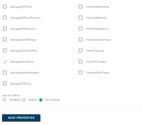 On the Properties tab on the right side, check the applicable security permission for the sitemap node to restrict access to only users with the permission. If multiple permissions are selected, the user will only be required to have one permission to access the menu item. Select the security visibility option as desired.
