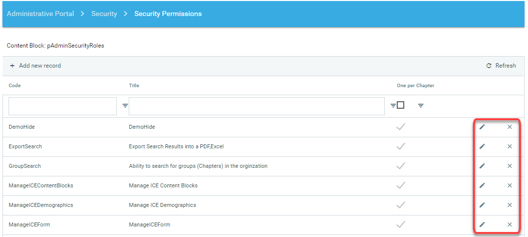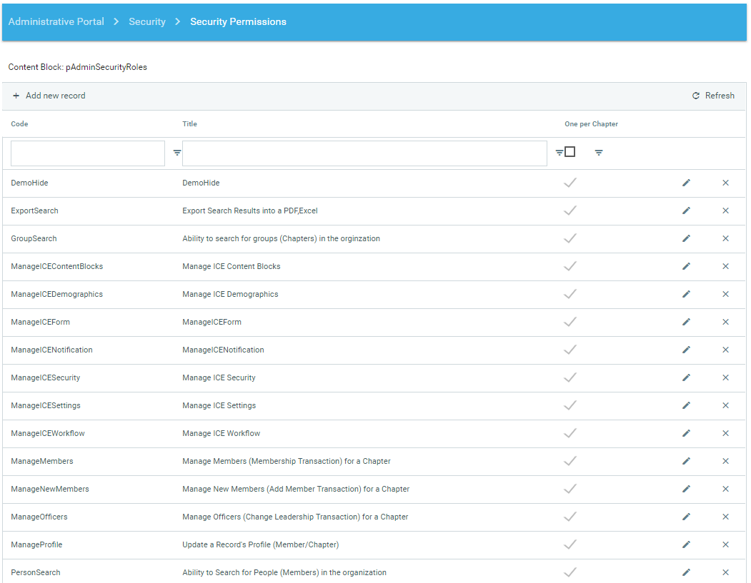 A Security Permission (or Security Role) is a permission you can apply to any sitemap node to restrict access to the specified URL. Only users having the Security Permission will be allowed to navigate to the URL of the sitemap node. Security permissions define what actions the groups can do in ICE. Permissions normally include Manage, View, or Submit. You can create specific permissions to an action if needed.