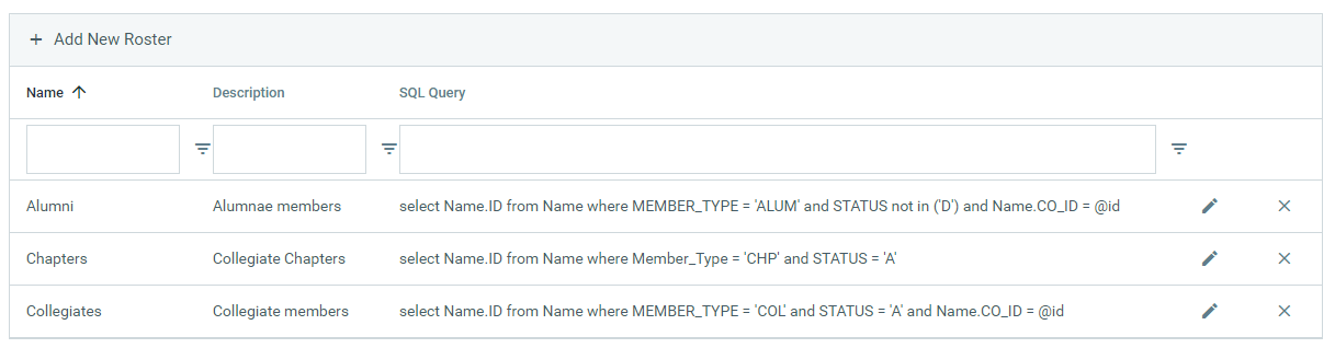 The roster configuration section is used to define additional roster queries to be used in ICE. The default roster query is the SubChapter.Roster SQL statement under the Membership Configuration section.
